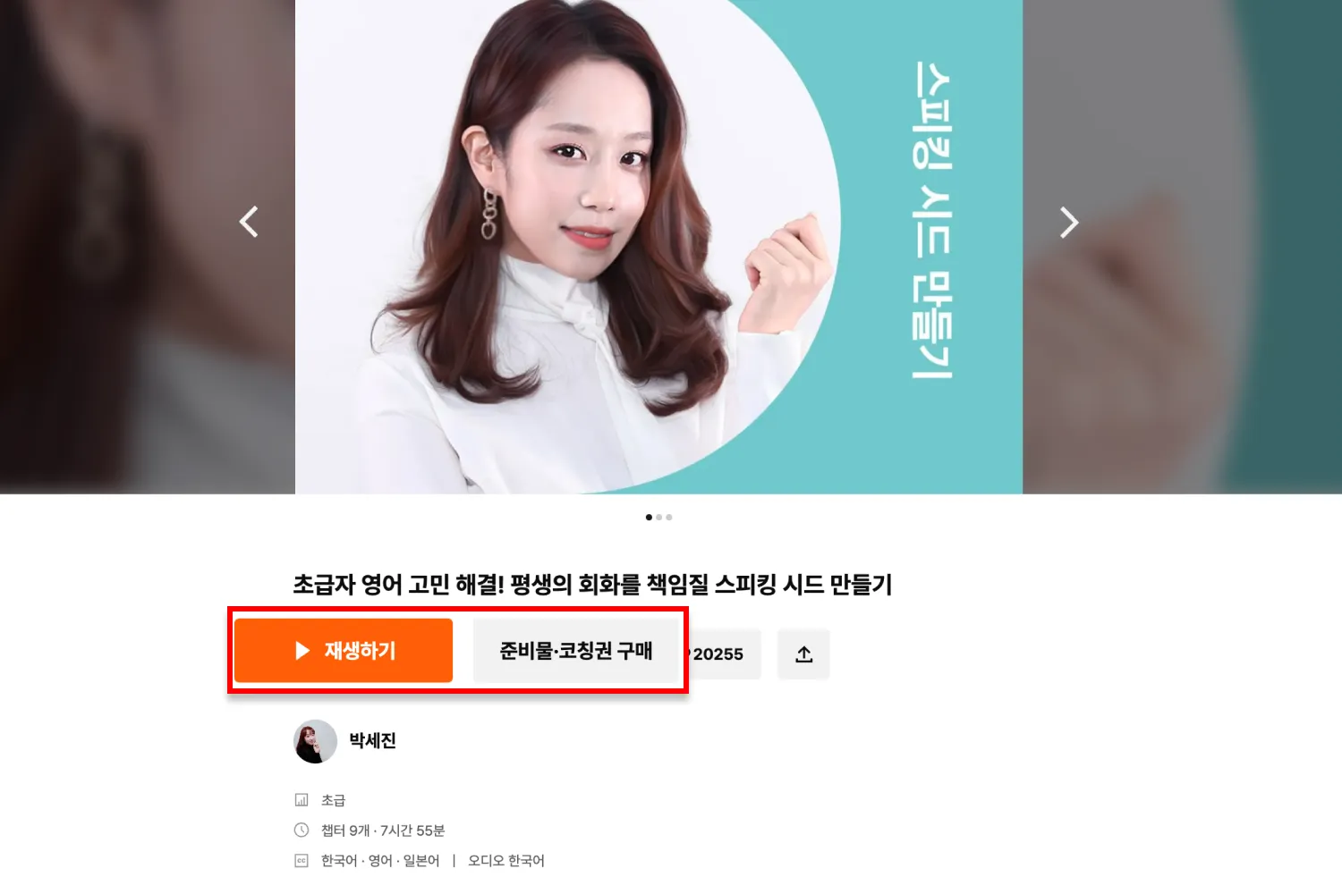클래스 소개를 확인하고, [재생하기] 버튼을 눌러 수강하세요. 원하는 경우, [준비물・코칭권 구매] 버튼을 눌러 수강에 필요한 준비물을 개별적으로 구매할 수 있습니다.